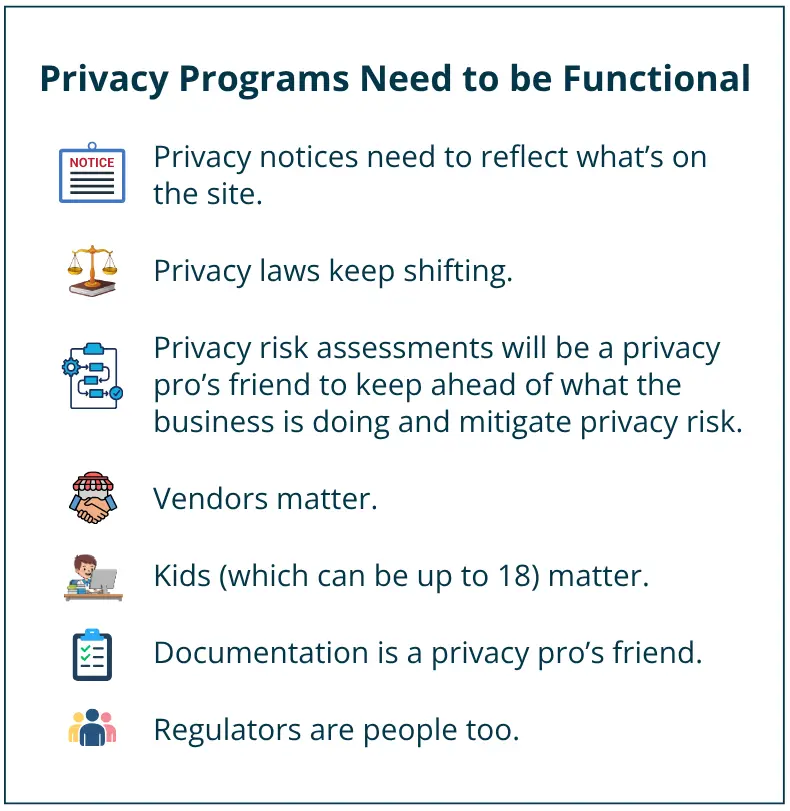 A major focus is on reducing consumer friction with privacy rights, and the audience was reminded to walk a mile in the customer’s shoes. Hint – test your own privacy rights processes (we love doing this for companies!).