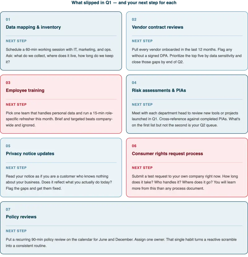 Q2 is for closing the gaps Q1 left open. Pick the two or three items from the list above that carry the most risk and get them done before June.