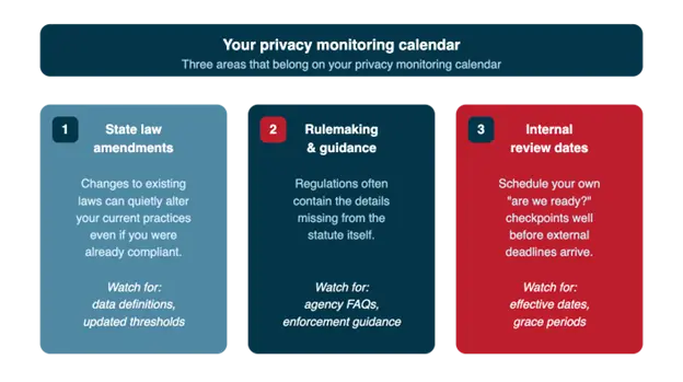 Even as you work through your Q1 backlog, the regulatory landscape keeps moving, and new states are passing laws, amendments, and new requirements are kicking in (hello CCPA Privacy Risk Assessments).
